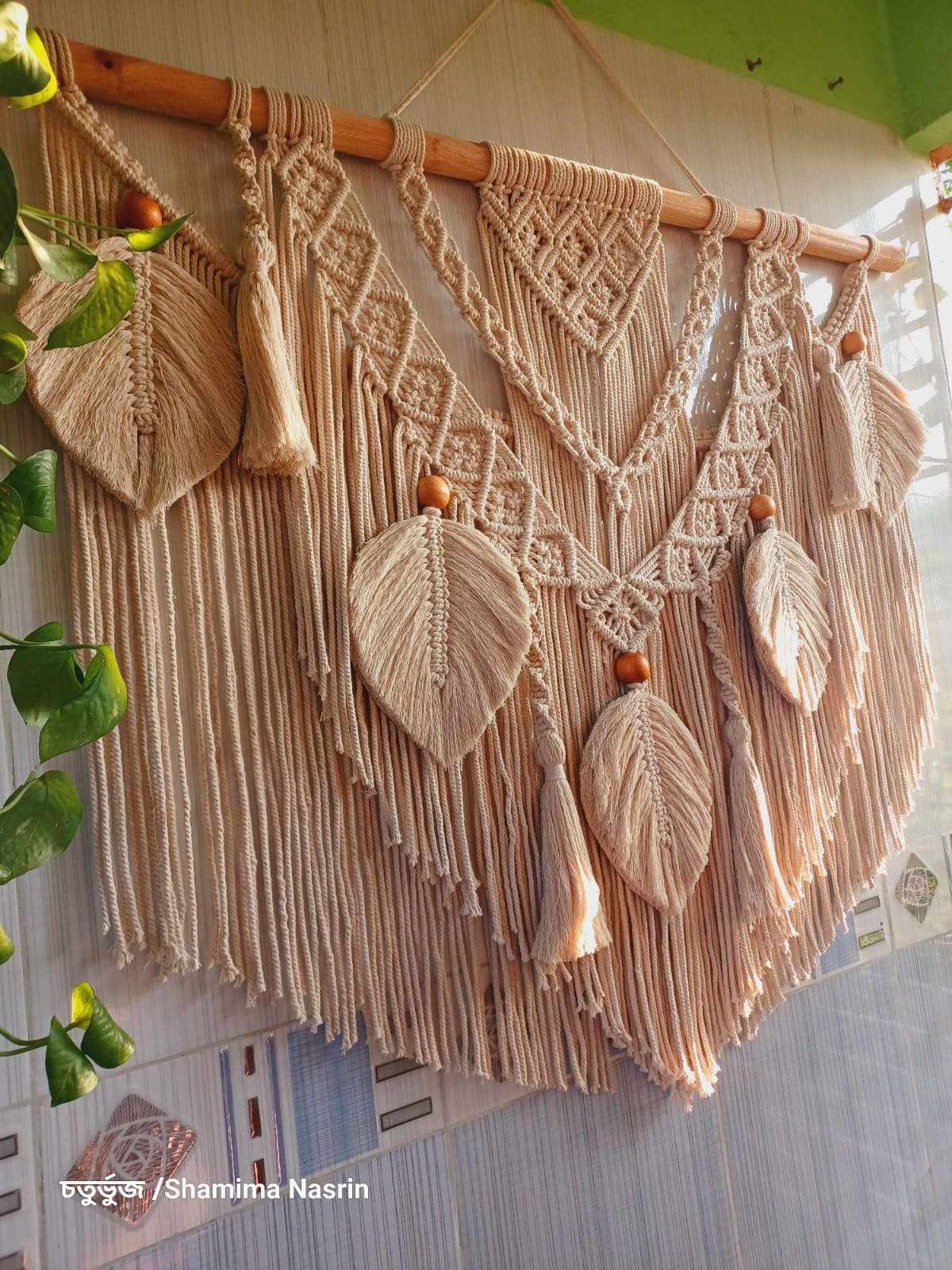 materials : Cotton rope, wooden stick, wooden beads, water proof glue.