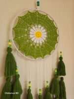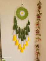 Bring a burst of sunshine and color into your space with this handcrafted Crochet Tassel Dream Catcher. Featuring a vibrant mix of green, yellow, and white, this piece is woven with love using summer yarn and natural cane. The design includes elegant hanging tassels and pearls that enhance its bohemian charm.